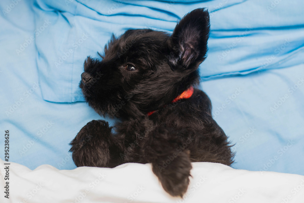 A Black Miniature Schnauzer Sleeping Tight Like A Baby Blue Pillow Stock Photo Adobe Stock